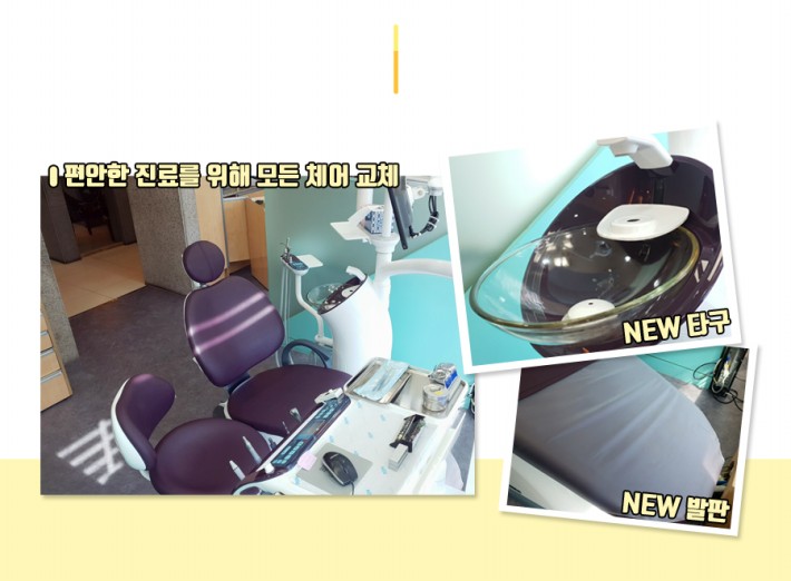 편안하게 앉으시고 누워서 진료받으실 수 있도록 새로운 의자와 입을 헹구는 타구, 발판 등 모든것이