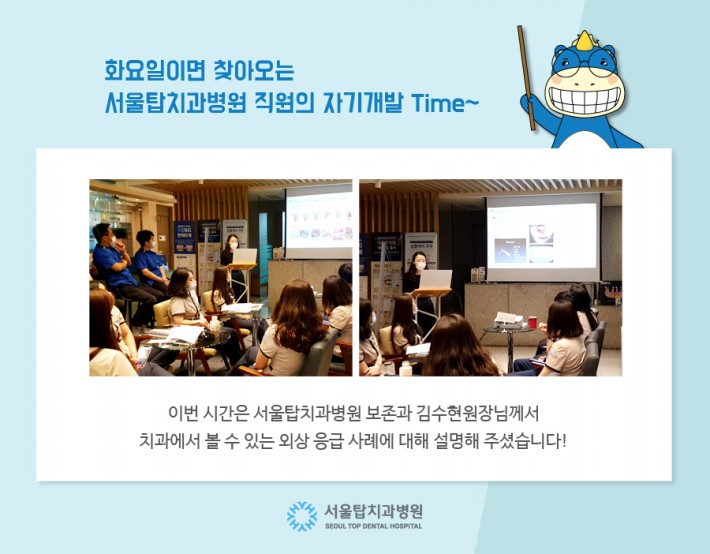서울탑치과병원은 매주 화요일마다 1시간씩 진료전에 세미나하는 시간을 가지고 있습니다.