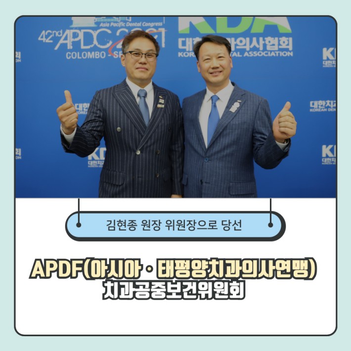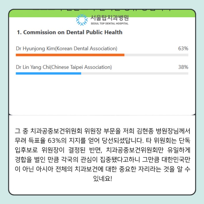 저희 김현종 병원장님께서 무려 득표율 63%의 지지를 얻어 APDF의 치과공중보건위원회 위원장으로 당선되셨답니다. 타 위원회는 단독 입후보로 위원장이 결정된 반면, 치과공중보건위원회만 유일하게 경합을 벌인 만큼 각국의 관심이 집중됐다고하니 그만큼 대한민국만이 아닌 아시아 전체의 치과보건에 대한 중요한 자리라는 것을 알 수 있네요!