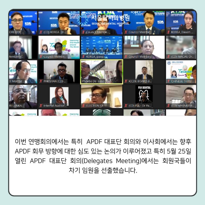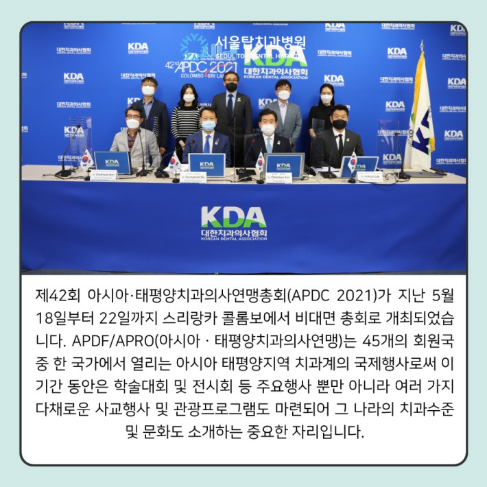 제42회 아시아·태평양치과의사연맹총회(APDC 2021)가 지난 5월 18일부터 22일까지 스리랑카 콜롬보에서 비대면 총회로 개최되었습니다.