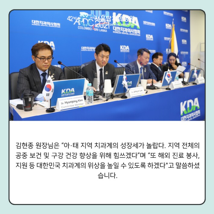 김현종 원장님은 “아·태 지역 치과계의 성장세가 놀랍다. 지역 전체의 공중 보건 및 구강 건강 향상을 위해 힘쓰겠다”며 “또 해외 진료 봉사, 지원 등 대한민국 치과계의 위상을 높일 수 있도록 하겠다"고 말씀하셨습니다.