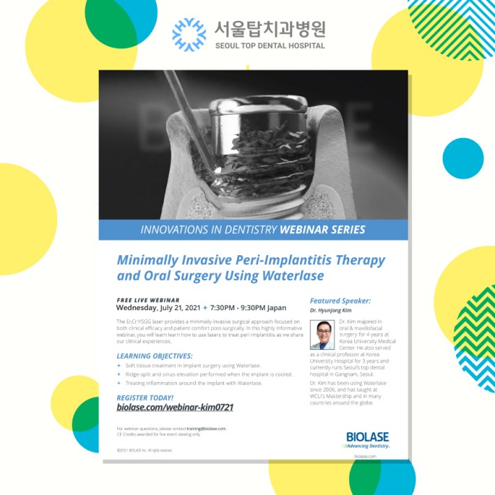 이번 온라인 강의는 미국, 일본, 한국 등 수십 개의 나라에서 동시에 송출되며 저희 김현종 원장님께서 일본 시간으로 오후 7시30분 부터 오후9시 30분까지 2시간에 걸쳐 "Minimally Invasive Peri-Implantitis Therapy and Oral Surgery Using Waterlase" (Water lase 레이저를 이용한 최소 침습 임플란트 주의염 치료와 구내 수술) 이라는 주제로 강의를 진행할 예정입니다.