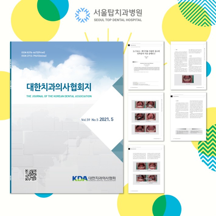 김현종 원장님은 평소 레이저 장비를 이용하여 임플란트 치료와 구강 내 수술 외에도 다양한 치료를 시행하면서 얻은 경험을 토대로 대한치과의사협회지에 저희 김현종 원장님의 논문인 "Er; YSGG 레이저를 이용한 설소대 단축증의 치료 증례보고"가 이번 21년 5월호의 임상가를 위한 특집에 게재되기도 했습니다.