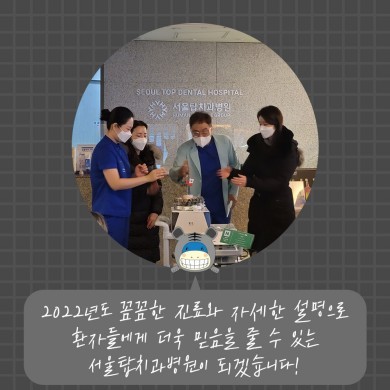 2022년 서울탑치과는 더욱 꼼꼼한 설명과 세심한 진료로 이루어질테니 치아 불편하신 곳 있으시면 부담가지지 말고 찾아와주셨으면 좋겠습니다.