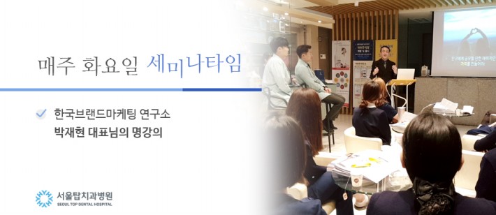 매주 화요일, 서울탑치과병원은 다양한 주제로 세미나를 진행하고 있습니다. 이번 화요일은 한국브랜드마케팅 연구소 박재현 대표님께서 강의하셨습니다. 박재현 대표님께서는 다양한 방송활동도 함께 하시며, 마케팅 분야에서 유명한 분이십니다. 우리 서울탑치과병원에 한달에 1번씩 오셔서 강의하고 계시는데요, 유익하고 즐거운 내용으로 모든 직원들이 이 시간을 기다렸습니다.