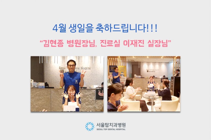 먼저, 이번 4월은 서울탑치과병원의 대표원장님이신 김현종 병원장님과 진료실 이재진 실장님의 생일이 있습니다.