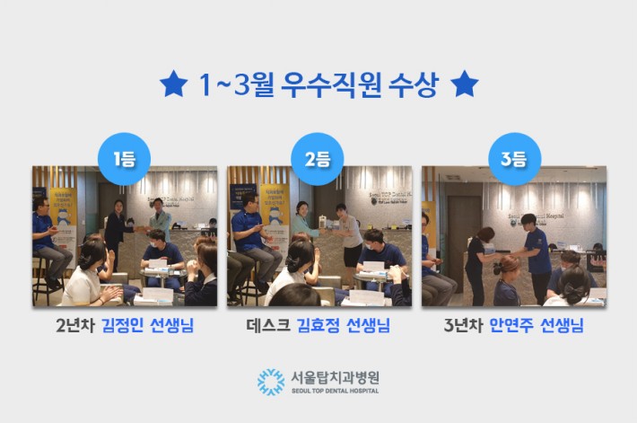 또, 서울탑치과병원에만 있는 특별한 시간, 바로 우수직원 수상입니다.