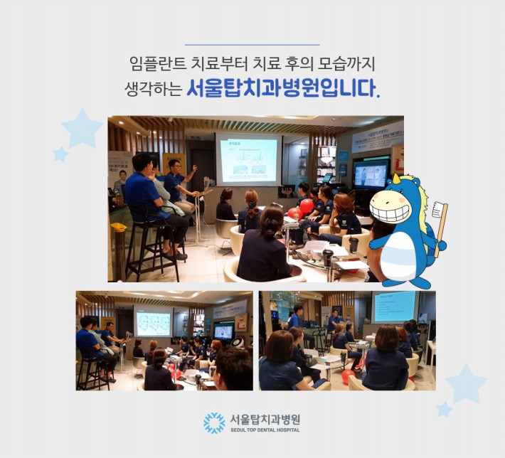 서울탑치과병원의 전 직원은 아침 일찍 모여 세미나를 실사하였습니다.