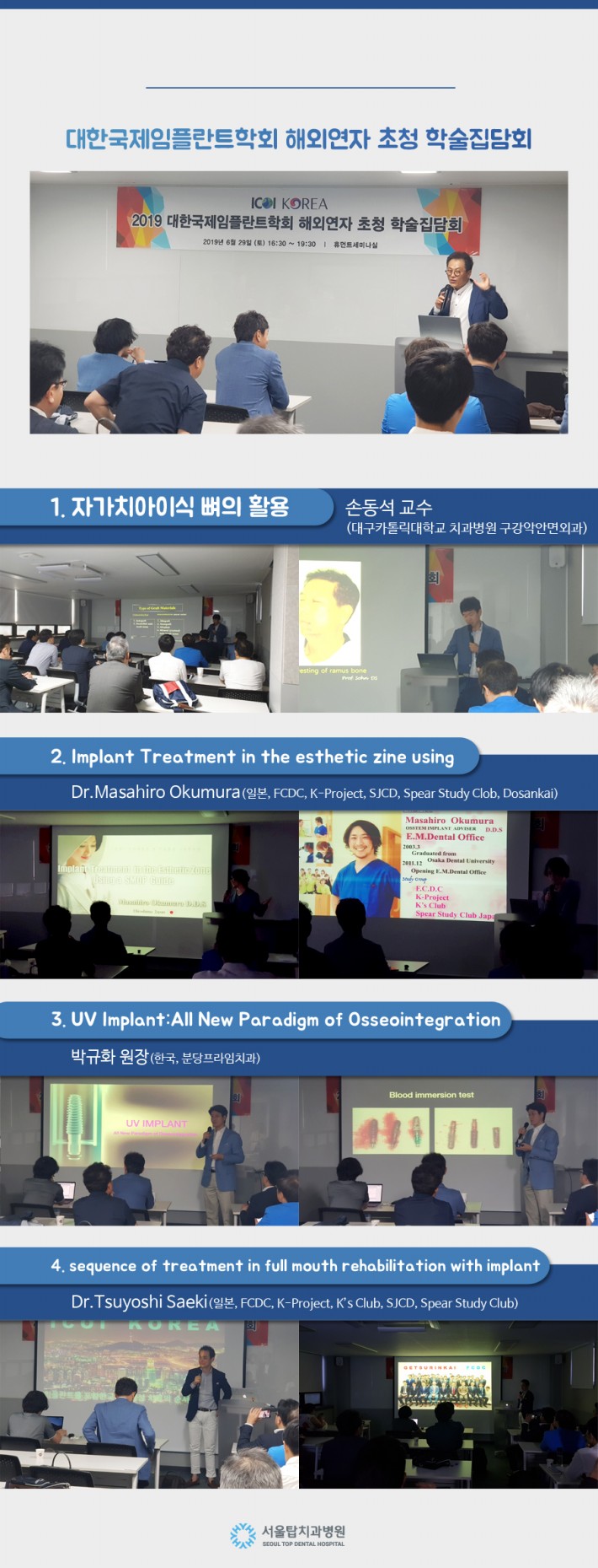 이번 학술집담회는 대한국제임플란트학회(ICOI)에서 주관하여, 한국과 일본의 의료진을 대상으로 강의를 진행하였으며, 서울탑치과병원 김현종 대표원장님께서는 ICOI 한국회 부회장으로 활동하고 계십니다.