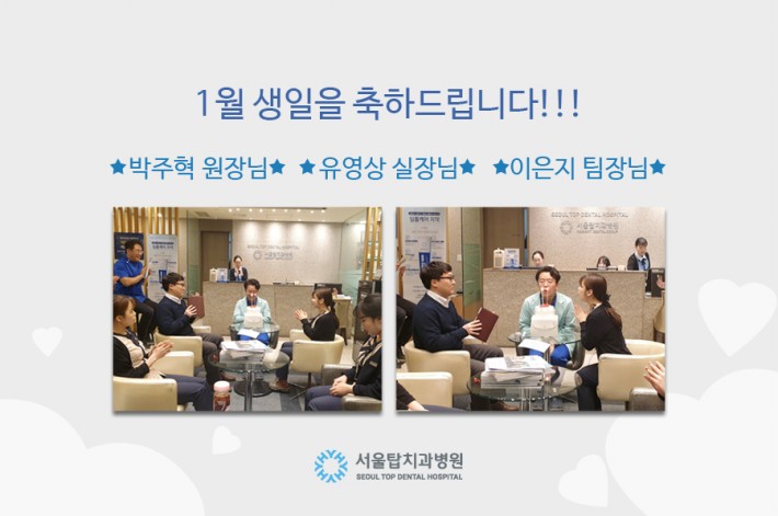 서울탑치과병원 통합진료과 박주혁 원장님, 경영지원실 유영상 실장님, 그리고 질료실 이은지 팀장님께서 1월에 생일이 있습니다!!!