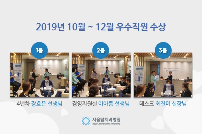1등에는 진료실 4년차 장효은 선생님, 2등에는 경영지원실 이아름 선생님, 3등에는 데스크 최진미 실장님으로