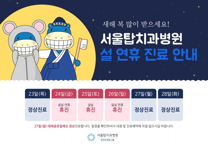 서울탑치과병원은 다가오는 24일(금)~26(일)까지 휴진입니다.