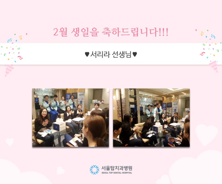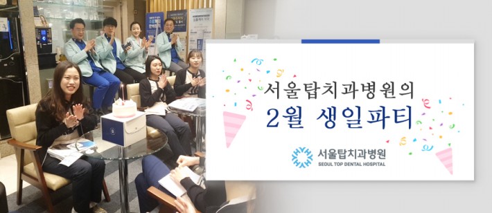 서울탑치과병원은 아침 일찍 모든 직원이 모여 2월 생일인 선생님을 축하하는 자리를 가졌습니다.