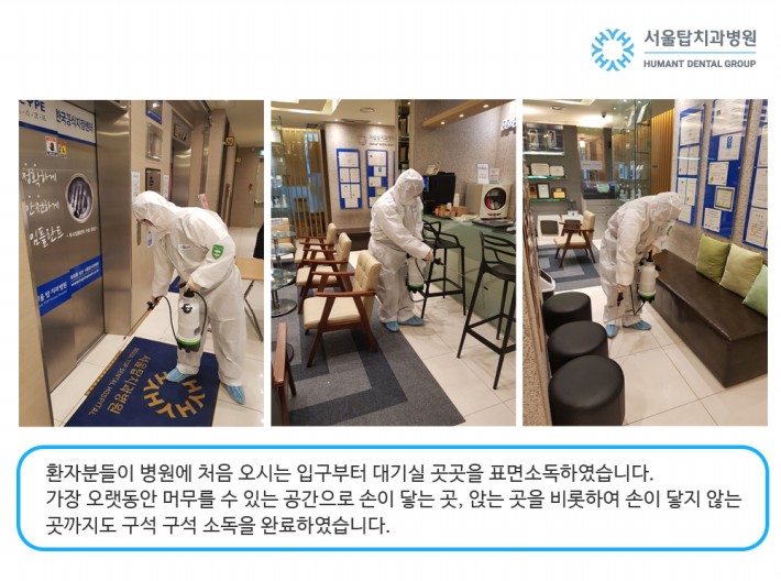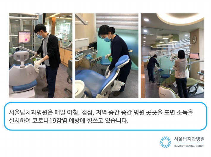 서울탑치과병원은 매일 아침, 점심, 저녁 진료중에도 직원들이 모두 나서서 대기실, 진료실 등 환자분들이