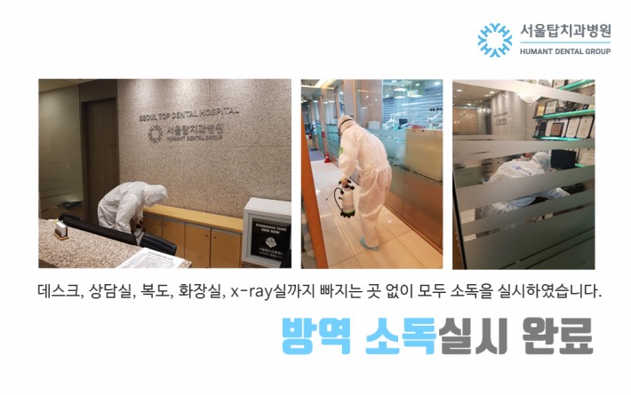 서울탑치과병원은 방역소독과 매일 소독을 실시하여 안심하고 방문하실 수 있습니다.
