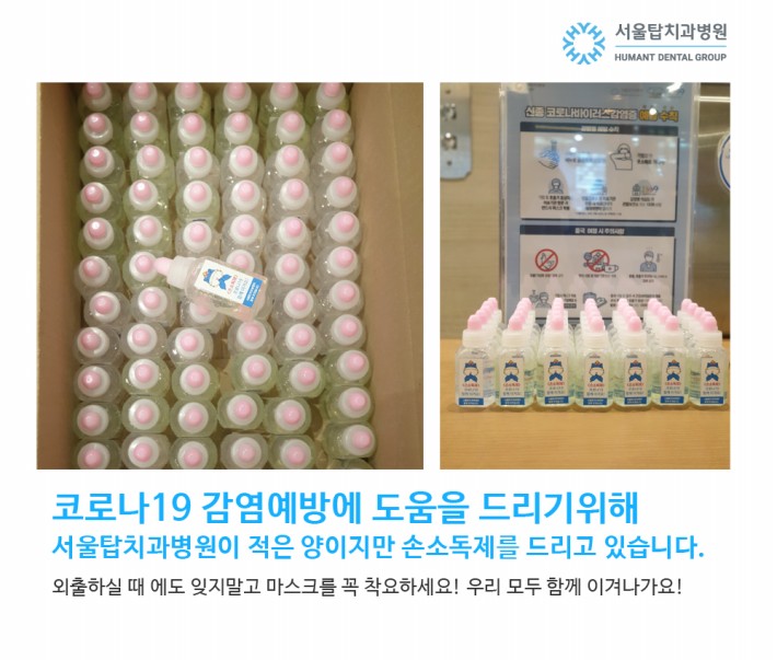 서울탑치과병원에 오시는 환자분들께 적은 양이지만 손소독제를 드리고 있습니다.