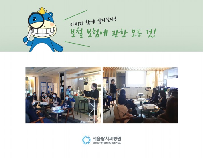서울탑치과병원은 일주일에 한번씩 임상, 마케팅, 이미지메이킹 등 다양한 주제로 세미나를 진행하고 있습니다.
