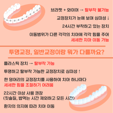 각각의 치아는 이동범위가 다르기 때문에 보기 좋은 치열을 가지려면 치아마다 장치를 붙이고 철사를 휘어 힘을 24시간 잇몸뼈에 전달해야합니다. 그러면 필요한 만큼 뼈를 녹이고 새로 생겨 치아가 이동합니다. 철사의 경우 둥글거나 사각의 철사를 이용해 치아 하나하나를 원하는 위치로 조절할 수 있습니다. 하지만 투명교정장치는 일반교정처럼 세세한 힘을 조절하기 어렵습니다. 장치가 한 덩어리로 만들어져 치아 하나하나 이동을 정해야하는데 장치를 끼우는 정확도, 시간, 소재에 따라 힘이 일정하지 않아 정밀한 조정이 어려울 수 있습니다. 투명한 얇은 쉘로 치아를 감싸 움직이게 만드는 투명교정은 치아가 이동하면 다음 장치를 써서 서서히 움직이게 만듭니다. 문제는 일반 교정장치는 치과의사가 만들어 놓은 상태로 24시간 치아에 일정한 힘을 줄 수 있지만 투명장치는 환자가 끼는 만큼 치아에 일정한 힘으로 밀게 됩니다. 투명장치는 24시간 보다 적은 시간을 사용하기 때문에 환자의지에 따라 치아가 이동하죠. 보통 투명장치는 최소 하루 22시간 착용을 원칙으로 많이 이야기하지만 실제 치료효과를 위해서는 하루도 빠지지 말고 양치와 식사시간을 빼고 계속 끼워야한다고 말합니다.