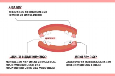 사랑니는 학술적으로 제3대구치라고 부르며 위턱 아래턱에 좌우로 각각 2개씩 해서 전체 4개의 사랑니가 있다. 보통 18세~20대 초반 사랑니가 불편한 이유는 지치주위염이라는 잇몸 염증 때문이다. 아래턱에 사랑니가 올라오면서 사랑니 일부만 보이고 나머지는 잇몸으로 덮여 빈 공간으로 음식물이나 염증세균이 모이면 염증이 생겨 붓고 통증이 나타난다. 심해지면 입이 잘 안 벌어지기도 한다. 이런 경우에는 계속 문제가 생기기 때문에 염증조절 후 곧바로 빼는 것이 좋다.또 하악사랑니가 옆으로 쓰러져서 올라오지 못하는 경우도 많다. 쓰러진 아래턱 사랑니는 앞에 치아를 녹이거나 충치의 원인이 되고 지치주위염의 원인이 될 수 있어 빼는 것을 권장한다. 하악사랑니를 빼려면 보통 위턱의 사랑니는 잇몸 안에 있어 보이지 않는 경우도 많다. 위턱사랑니가 밖으로 나오지 않고 문제가 없다면 일반적으로 발치하지 않는다. 치아가 있을 자리에 치아가 없는 경우를 무치증이라 부르는데 사랑니가 무치증이 많이 나타나는 부위다. 사랑니가 없는 경우 흔히들 농담으로 진화가 더 된 사람이라도 이야기하는데 통상적으로 우리나라사람의 경우 사랑니가 없는 경우가 41% 정도다. 재미있는것은 사랑니가 나타나지 않을 확률이 나라마다 다르다는 것이다. 조사에 따르면 영국사람은 약 12.7%, 칠레 사람은 24.75%, 말레이시아는 30~33%에게서 사랑니가 생기지 않는다.알려진대로 진화했기 때문에 사랑니가 없다면 우리나라 사람이 제일 진화된 민족인 것이다. 사랑니가 없는 경우 부위마다도 다른데 우측윗사랑니가 제일 많고 그다음은 왼쪽 위, 그다음이 오른쪽 아래 사랑니, 왼쪽 아래 사랑니 순으로 사랑니가 없을 확률이 높다.