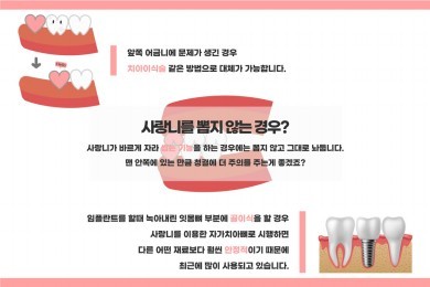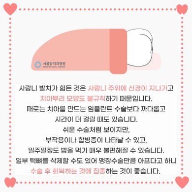 사랑니발치가 힘든 것은 사랑니 주위에 신경이 지나가고 치아뿌리의 모양도 불규칙하기 때문이다. 때로는 치아를 만드는 임플란트수술보다 까다롭고 시간이 더 걸릴 때가 있다. 쉬운 수술 같지만 부작용이나 합병증이 나타날 수 있고 일주일 정도 밥 먹기가 매우 불편해질 수도 있다. 일부 턱뼈를 삭제할 수도 있어 맹장수술만큼 아프다고 한다. 따라서 수술 후 회복하는 것에 집중해야한다. 젊은 시절의 사랑니발치는 부담스럽지만 치과를 찾아 상담받는 것이 좋다. 처음 찾아오는 사랑처럼 이러지도 저러지도 못하는 것보다는 일을 해결할 수 있는 최선의 방법이다.