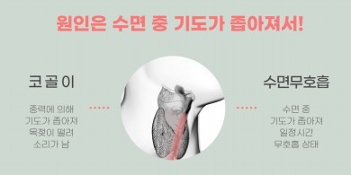 코골이와 무호흡증은 모두 기도가 좁아져서 나타나는 공통적인 증상입니다. 코골이는 사람이 누어서 잠을 잘 때 턱과 입천장의 부드러운 목젖 부위가 중력에 의해 내려와 기도 부분이 좁아지는데요. 이때 자는 동안에 부위가 떨려서 소리가 나는 것입니다.