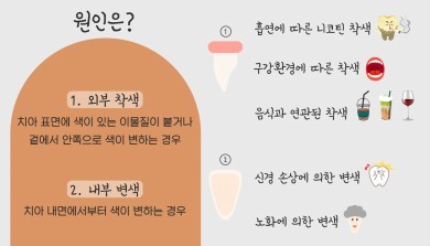 첫째는 치아 표면에 색이 있는 이물질이 붙거나 겉에서 안쪽으로 색이 변하는 경우, 둘째는 치아 내면에서부터 색이 변하는 경우다.