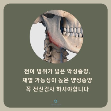 양성종양은 문제가 있는 조직만 제거하면 되지만 악성의 경우 전이 때문에 하나만 있더라도 꼭 전신검사를 해야합니다.